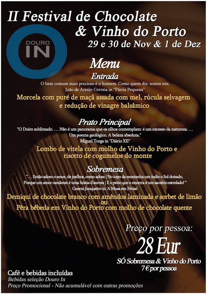 Pelo segundo ano consecutivo a Douro Wonderful Events realizará o Festival de Chocolate e Vinho do Porto na cidade do Peso da Régua, que decorrerá de 29 de novembro a 1 de dezembro no Solar do Vinho do Porto e no Teatrinho da cidade.